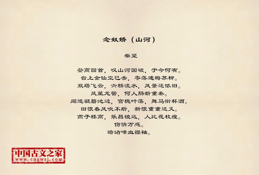 登高回首,叹山河国破,于今何有。台上金仙空已去,零落逋梅苏柳。双塔飞云,六桥流水,风景还依旧。凤笙龙管,何人肠断重奏。闻道凝碧池边,宫槐叶落,舞马衔杯酒。旧恨春风吹不断,新恨重重还又。燕子楼高,乐昌镜远,人比花枝瘦。伤情万感。暗沾啼血襟袖。