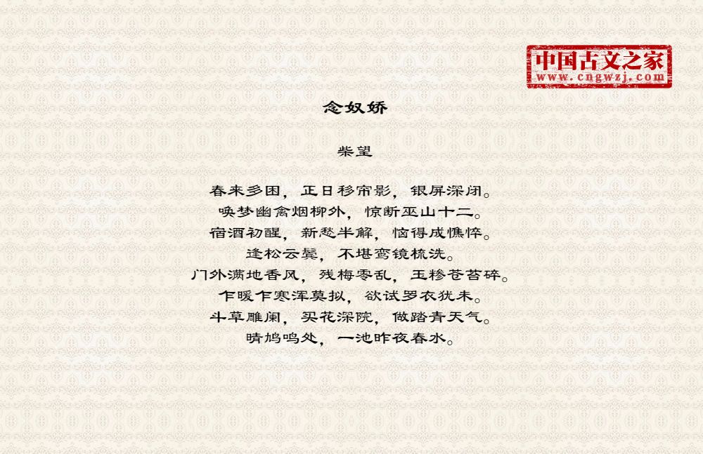 春来多困,正日移帘影,银屏深闭。唤梦幽禽烟柳外,惊断巫山十二。宿酒初醒,新愁半解,恼得成憔悴。逢松云鬓,不堪鸾镜梳洗。门外满地香风,残梅零乱,玉糁苍苔碎。乍暖乍寒浑莫拟,欲试罗衣犹未。斗草雕阑,买花深院,做踏青天气。晴鸠鸣处,一池昨夜春水。