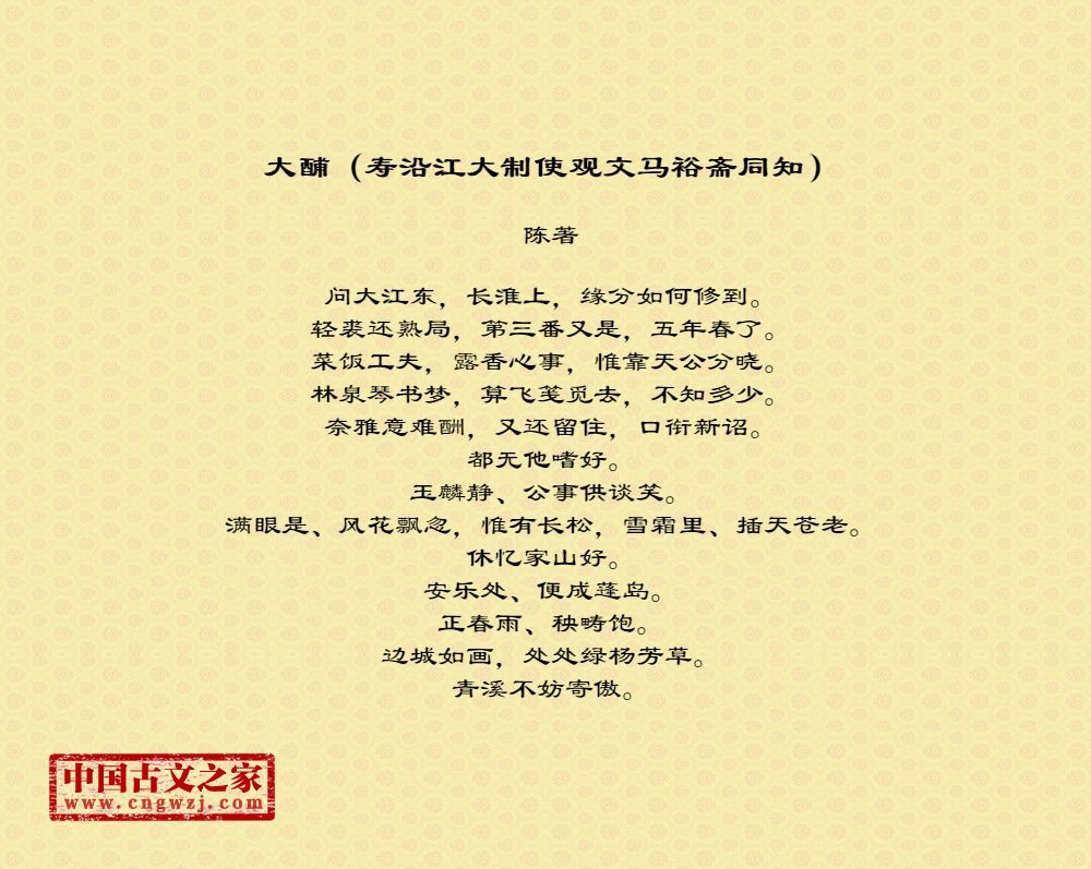 《大酺(寿沿江大制使观文马裕斋同知)》的原文打印版(陈著)