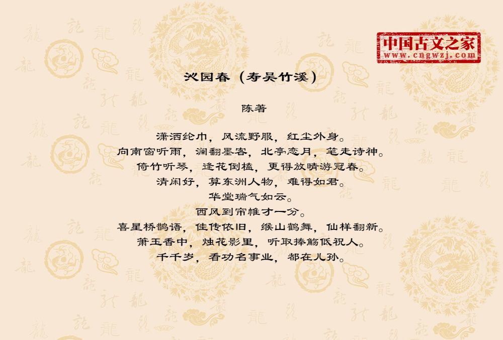 潇洒纶巾,风流野服,红尘外身。向南窗听雨,澜翻墨客,北亭恋月,笔走诗神。倚竹听琴,逢花倒榼,更得放晴游冠春。清闲好,算东洲人物,难得如君。华堂瑞气如云。西风到帘帷才一分。喜星桥鹊语,佳传依旧,缑山鹤舞,仙样翻新。箫玉香中,烛花影里,听取捧觞低祝人。千千岁,看功名事业,都在儿孙。