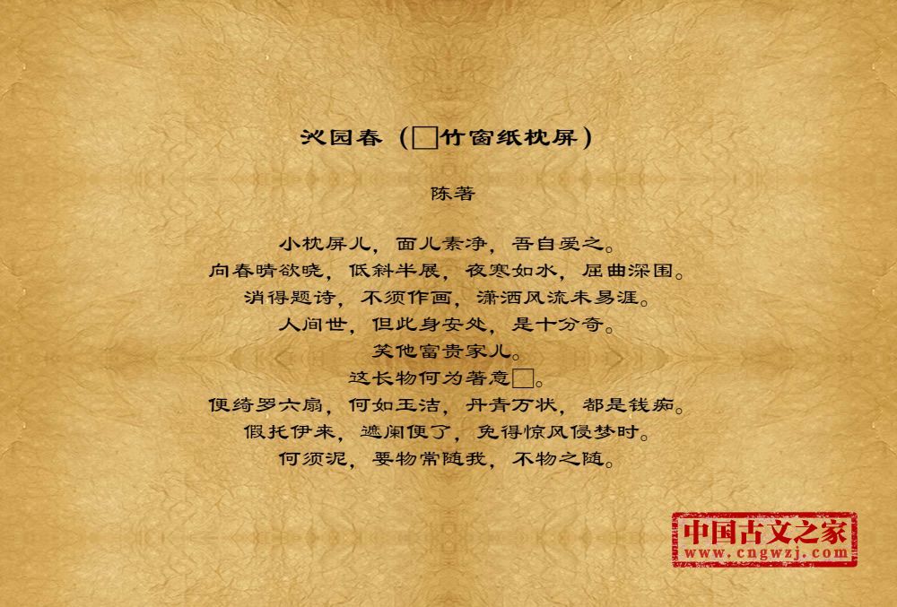小枕屏儿,面儿素净,吾自爱之。向春晴欲晓,低斜半展,夜寒如水,屈曲深围。消得题诗,不须作画,潇洒风流未易涯。人间世,但此身安处,是十分奇。笑他富贵家儿。这长物何为著意□。便绮罗六扇,何如玉洁,丹青万状,都是钱痴。假托伊来,遮阑便了,免得惊风侵梦时。何须泥,要物常随我,不物之随。