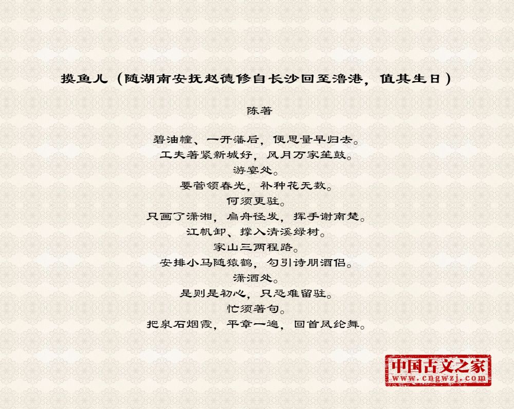 《摸鱼儿(随湖南安抚赵德修自长沙回至澛港,值其生日)》由陈著创作