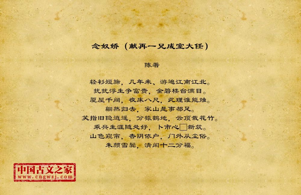 《念奴娇(献再一兄成室大任)》由陈著创作