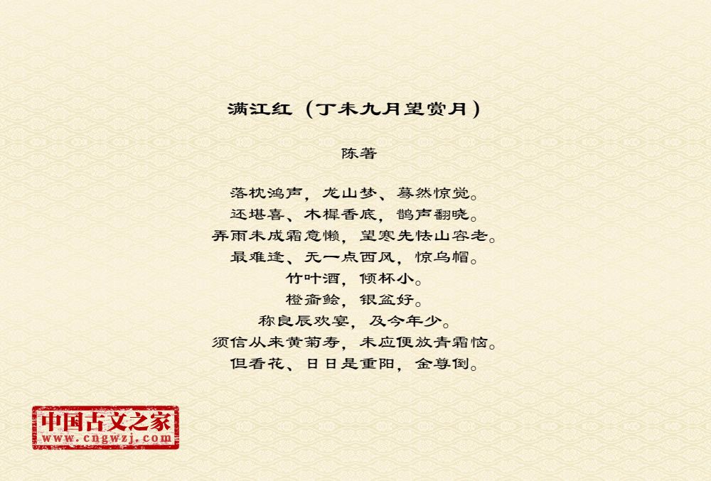 落枕鸿声,龙山梦、蓦然惊觉。还堪喜、木樨香底,鹊声翻晓。弄雨未成霜意懒,望寒先怯山容老。最难逢、无一点西风,惊乌帽。竹叶酒,倾杯小。橙齑鲙,银盆好。称良辰欢宴,及今年少。须信从来黄菊寿,未应便放青霜恼。但看花、日日是重阳,金尊倒。