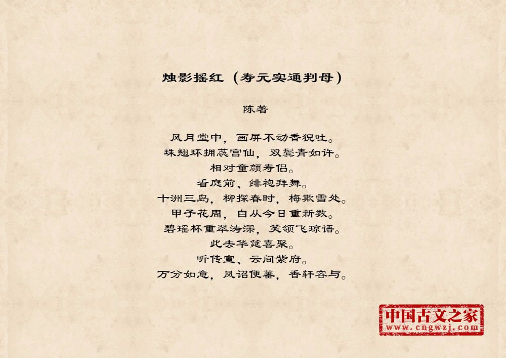 风月堂中,画屏不动香猊吐。珠翘环拥蕊宫仙,双鬓青如许。相对童颜寿侣。看庭前、绯袍拜舞。十洲三岛,柳探春时,梅欺雪处。甲子花周,自从今日重新数。碧瑶杯重翠涛深,笑领飞琼语。此去华筵喜聚。听传宣、云间紫府。万分如意,凤诏便蕃,香轩容与。