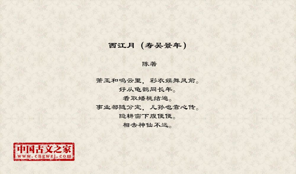 箫玉和鸣云里,彩衣娱舞风前。好从龟鹤同长年。看取蟠桃结遍。事业都随分定,儿孙也靠心传。隐耕窗下腹便便。相去神仙不远。