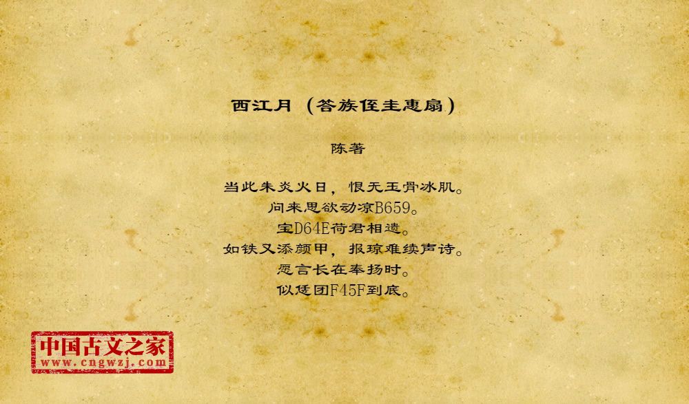 当此朱炎火日,恨无玉骨冰肌。问来思欲动凉B659。宝D64E荷君相遗。如铁又添颜甲,报琼难续声诗。愿言长在奉扬时。似恁团F45F到底。