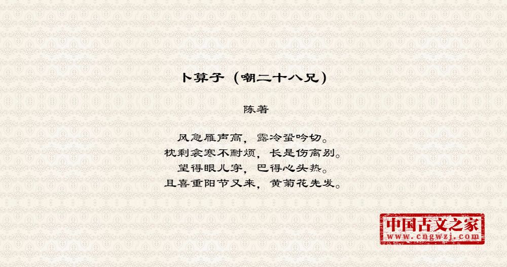 风急雁声高,露冷蛩吟切。枕剩衾寒不耐烦,长是伤离别。望得眼儿穿,巴得心头热。且喜重阳节又来,黄菊花先发。