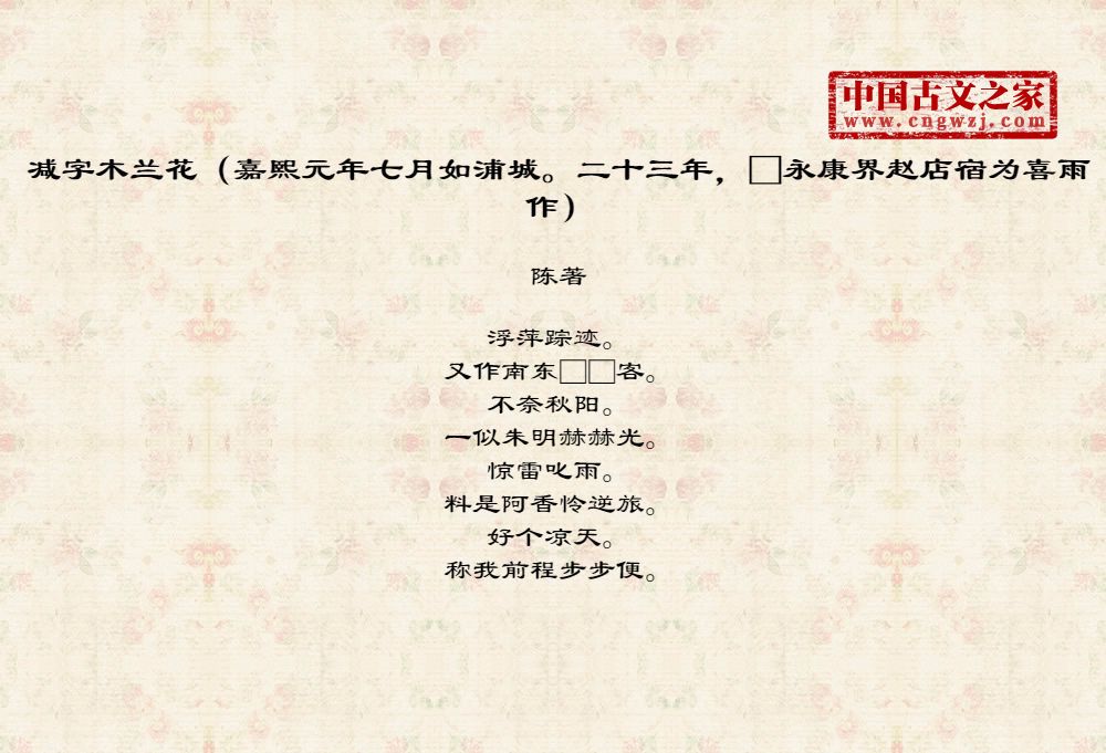 《减字木兰花(嘉熙元年七月如浦城。二十三年,□永康界赵店宿为喜雨作)》由陈著创作