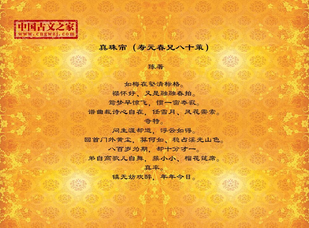 如梅在壑清标格。襟怀好、又是融融春拍。鸳梦早惊飞,惯一窗岑寂。谱曲裁诗心自在,任雪月、风花需索。奇特。问生涯却道,浮云如得。回首门外黄尘,算何如、稳占溪光山色。八百岁为期,却十分才一。弟自高歌儿自舞,簇小小、榴花筵席。真率。镇无妨欢醉,年年今日。