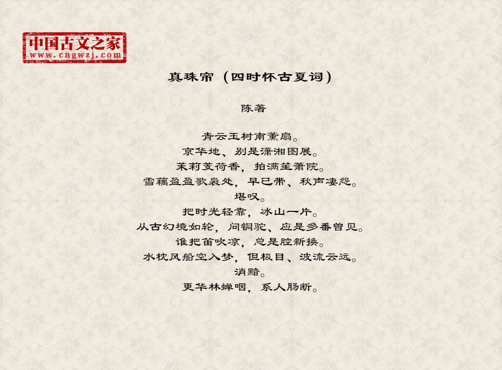 青云玉树南薰扇。京华地、别是潇湘图展。茉莉芰荷香,拍满笙萧院。雪藕盈盈歌袅处,早已带、秋声凄怨。堪叹。把时光轻靠,冰山一片。从古幻境如轮,问铜驼、应是多番曾见。谁把笛吹凉,总是腔新换。水枕风船空入梦,但极目、波流云远。消黯。更华林蝉咽,系人肠断。