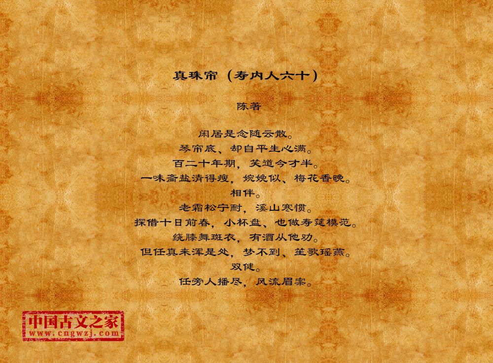 闲居是念随云散。琴帘底、却自平生心满。百二十年期,笑道今才半。一味齑盐清得瘦,婉娩似、梅花香晚。相伴。老霜松宁耐,溪山寒惯。探借十日前春,小杯盘、也做寿筵模范。绕膝舞斑衣,有酒从他劝。但任真来浑是处,梦不到、笙歌瑶燕。双健。任旁人播尽,风流眉案。