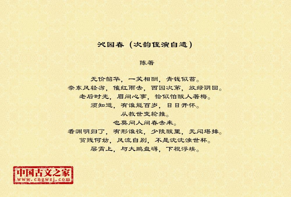 无价韶华,一笑相酬,青钱似苔。奈东风轻劣,催红雨去,西园次第,放绿阴回。老后时光,眉间心事,恰似怕酸人著梅。须知道,有谁能百岁,日日开怀。从教世变轮推。也莫问人间春去来。看渊明归了,有形谁役,少陵酸里,无闷堪排。贫贱何妨,风流自别,不是沈沈浊世杯。层霄上,与大鹏盘礴,下视浮埃。