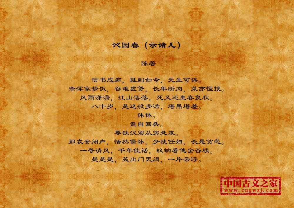 信书成痴,捱到如今,无生可谋。奈浑家梦饭,谷难虚贷,长年断肉,菜亦慳搜。风雨潇潇,江山落落,死又还生春复秋。八十岁,是这般多活,堪吊堪羞。休休。盍自回头。要铁汉须从穷处求。那袁安闭户,恬然僵卧,少陵任妇,长是贫愁。一等清风,千年佳话,蚁蚋看他金谷楼。是是是,笑出门天阔,一片云浮。