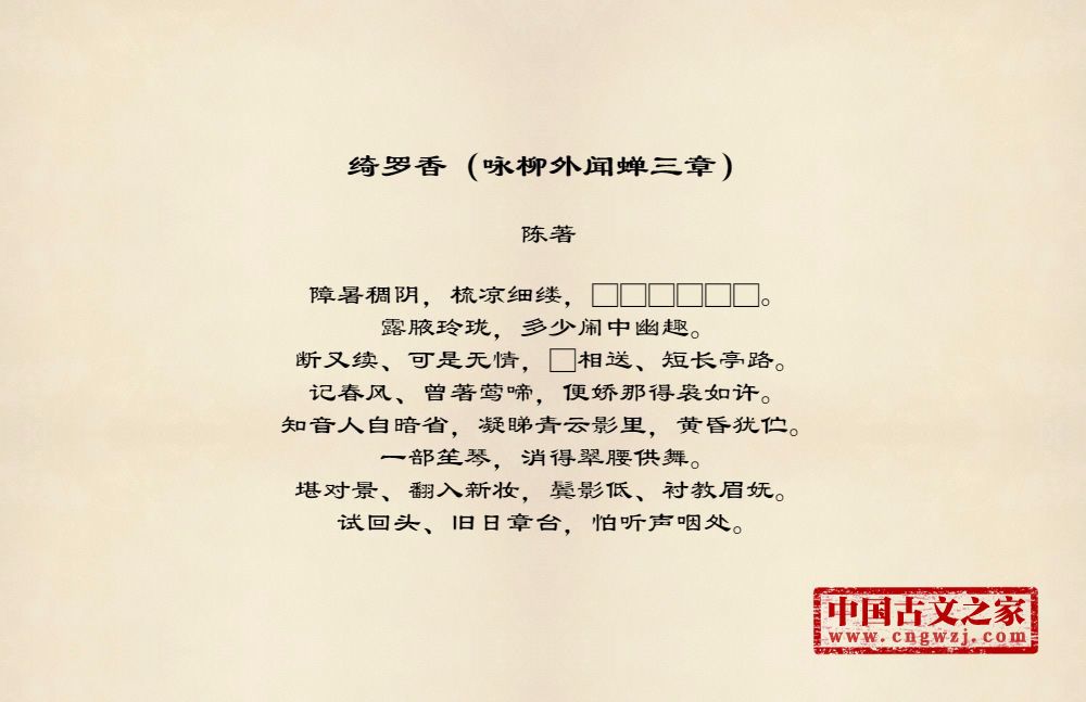 障暑稠阴,梳凉细缕,□□□□□□。露腋玲珑,多少闹中幽趣。断又续、可是无情,□相送、短长亭路。记春风、曾著莺啼,便娇那得袅如许。知音人自暗省,凝睇青云影里,黄昏犹伫。一部笙琴,消得翠腰供舞。堪对景、翻入新妆,鬓影低、衬教眉妩。试回头、旧日章台,怕听声咽处。
