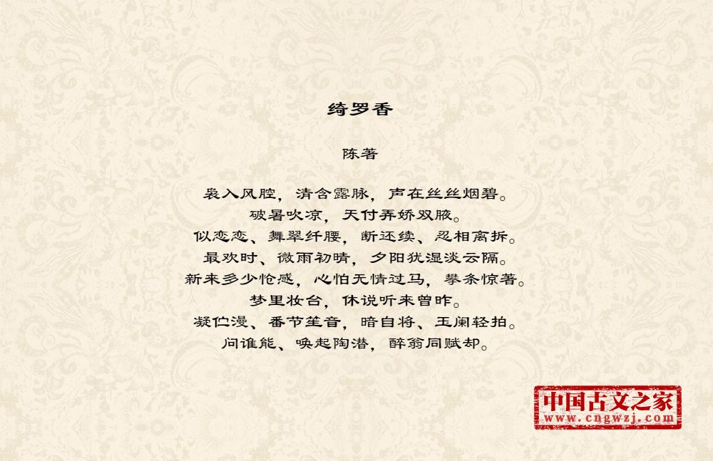 袅入风腔,清含露脉,声在丝丝烟碧。破暑吹凉,天付弄娇双腋。似恋恋、舞翠纤腰,断还续、忍相离拆。最欢时、微雨初晴,夕阳犹湿淡云隔。新来多少怆感,心怕无情过马,攀条惊著。梦里妆台,休说听来曾昨。凝伫漫、番节笙音,暗自将、玉阑轻拍。问谁能、唤起陶潜,醉翁同赋却。