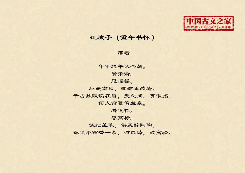 年年端午又今朝。鬓萧萧。思摇摇。应是南风,湘浦正波涛。千古独醒魂在否,无处问,有谁招。何人帘幕倚兰皋。看飞桡。夺高标。饶把笙歌,供笑醉陶陶。孤坐小窗香一篆,弦绿绮,鼓离骚。