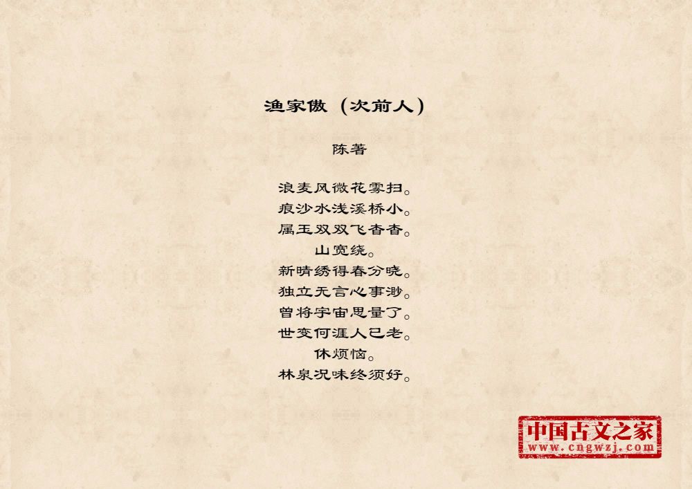 浪麦风微花雾扫。痕沙水浅溪桥小。属玉双双飞杳杳。山宽绕。新晴绣得春分晓。独立无言心事渺。曾将宇宙思量了。世变何涯人已老。休烦恼。林泉况味终须好。
