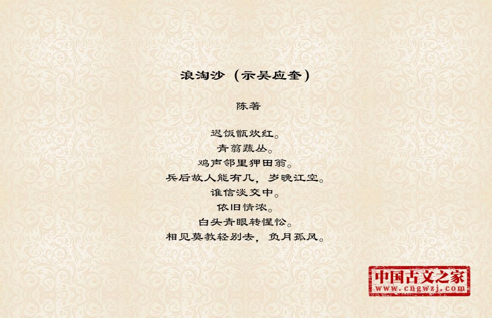 迟饭甑炊红。青翦蔬丛。鸡声邻里狎田翁。兵后故人能有几,岁晚江空。谁信淡交中。依旧情浓。白头青眼转惺忪。相见莫教轻别去,负月孤风。