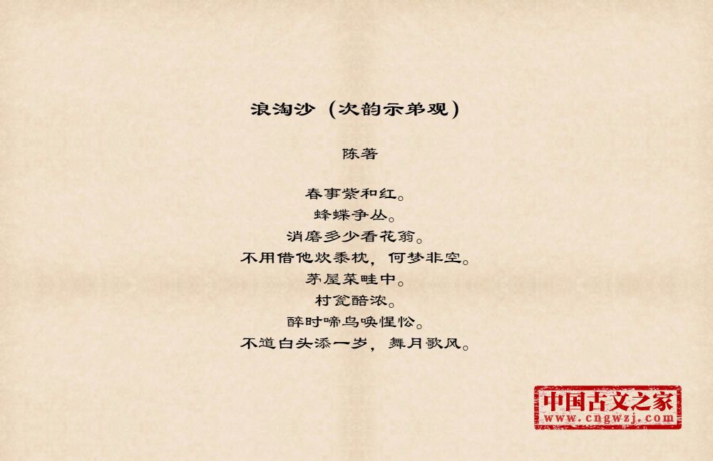 春事紫和红。蜂蝶争丛。消磨多少看花翁。不用借他炊黍枕,何梦非空。茅屋菜畦中。村瓮醅浓。醉时啼鸟唤惺忪。不道白头添一岁,舞月歌风。