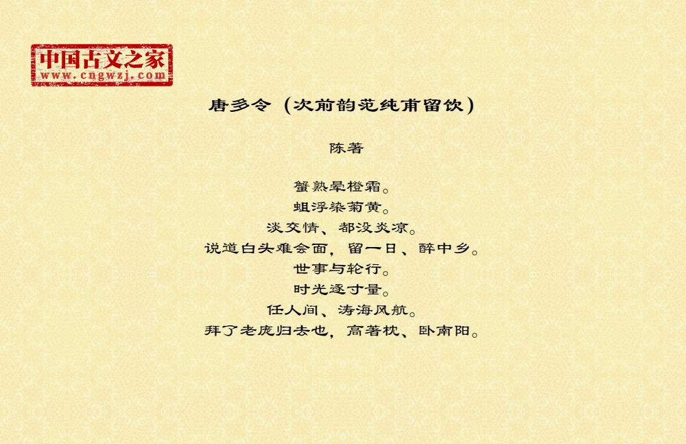 《唐多令(次前韵范纯甫留饮)》的原文打印版(陈著)