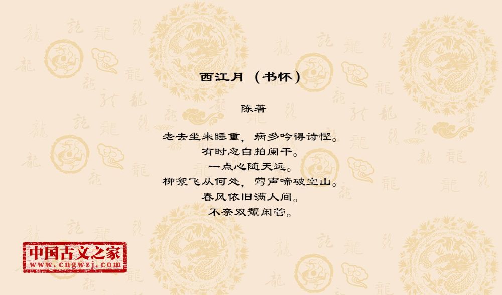 老去坐来睡重,病多吟得诗慳。有时忽自拍阑干。一点心随天远。柳絮飞从何处,莺声啼破空山。春风依旧满人间。不奈双颦闲管。