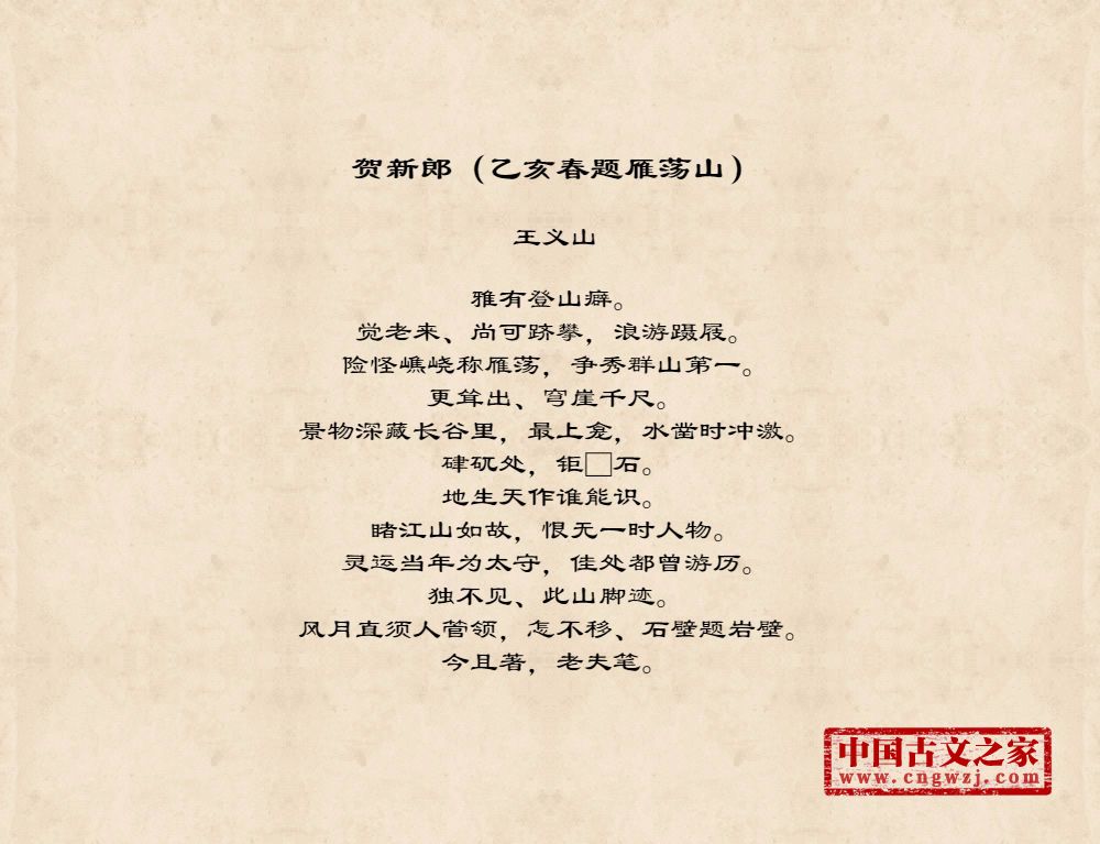 雅有登山癖。觉老来、尚可跻攀,浪游蹑屐。险怪嶕峣称雁荡,争秀群山第一。更耸出、穹崖千尺。景物深藏长谷里,最上龛,水凿时冲激。硉矹处,钜□石。地生天作谁能识。睹江山如故,恨无一时人物。灵运当年为太守,佳处都曾游历。独不见、此山脚迹。风月直须人管领,怎不移、石壁题岩壁。今且著,老夫笔。