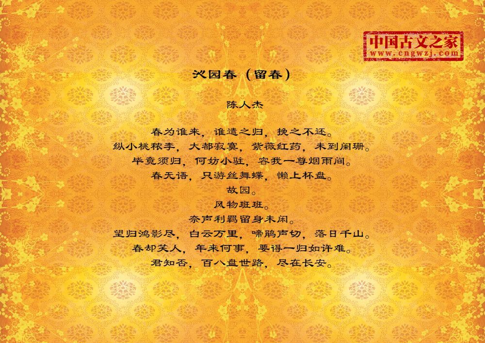 春为谁来,谁遣之归,挽之不还。纵小桃秾李,大都寂寞,紫薇红药,未到阑珊。毕竟须归,何妨小驻,容我一尊烟雨间。春无语,只游丝舞蝶,懒上杯盘。故园。风物班班。奈声利羁留身未闲。望归鸿影尽,白云万里,啼鹃声切,落日千山。春却笑人,年来何事,要得一归如许难。君知否,百八盘世路,尽在长安。
