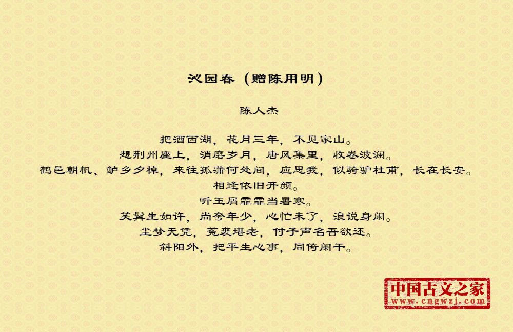把酒西湖,花月三年,不见家山。想荆州座上,消磨岁月,唐风集里,收卷波澜。鹤邑朝帆、鲈乡夕棹,来往孤蒲何处间,应思我,似骑驴杜甫,长在长安。相逢依旧开颜。听玉屑霏霏当暑寒。笑髯生如许,尚夸年少,心忙未了,浪说身闲。尘梦无凭,菟裘堪老,付子声名吾欲还。斜阳外,把平生心事,同倚阑干。