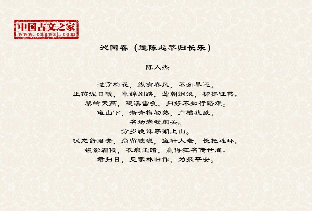 《沁园春(送陈起莘归长乐)》的原文打印版(陈人杰)