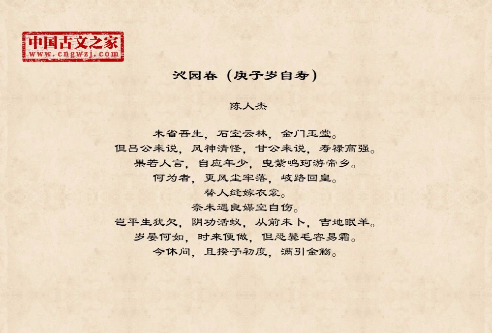 未省吾生,石室云林,金门玉堂。但吕公来说,风神清怪,甘公来说,寿禄高强。果若人言,自应年少,曳紫鸣珂游帝乡。何为者,更风尘牢落,岐路回皇。替人缝嫁衣裳。奈未遇良媒空自伤。岂平生犹欠,阴功活蚁,从前未卜,吉地眠羊。岁晏何如,时来便做,但恐鬓毛容易霜。今休问,且揆予初度,满引金觞。