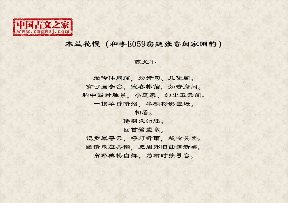 《木兰花慢(和李E059房题张寄闲家圃韵)》的原文打印版(陈允平)