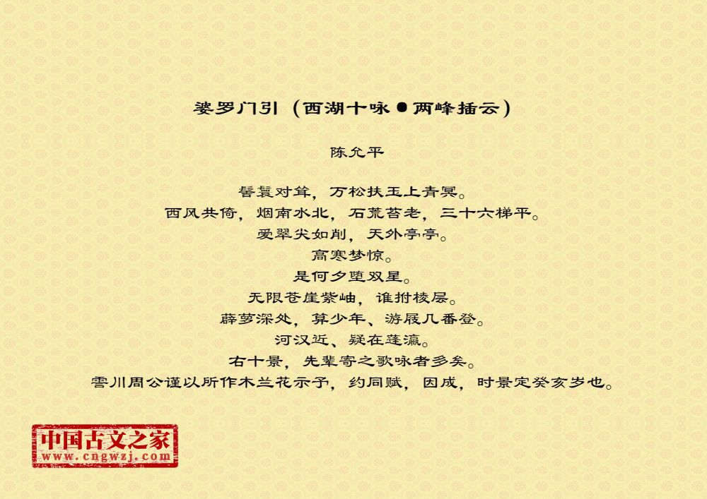 《婆罗门引(西湖十咏·两峰插云)》由陈允平创作