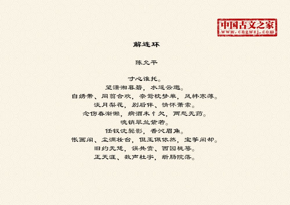 寸心谁托。望潇湘暮碧,水遥云邈。自绣带、同翦合欢,奈鸳枕梦单,凤帏寒薄。淡月梨花,别后伴、情怀萧索。念伤春渐懒,病酒未忄欠,两愁无药。魂销翠兰紫若。任钗沈鬓影,香沁眉角。怅画阁、尘满妆台,但玉佩依然,宝筝闲却。旧约无恁,误共赏、西园桃萼。正天涯、数声杜宇,断肠院落。