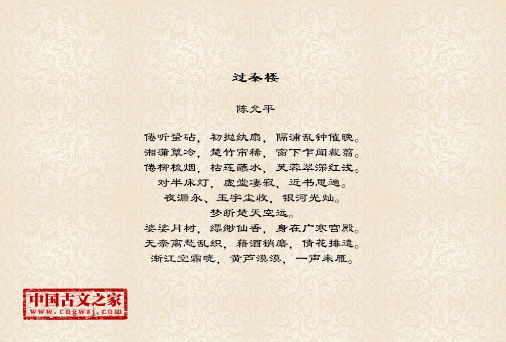 倦听蛩砧,初抛纨扇,隔浦乱钟催晚。湘蒲簟冷,楚竹帘稀,窗下乍闻裁翦。倦柳梳烟,枯莲蘸水,芙蓉翠深红浅。对半床灯,虚堂凄寂,近书思遍。夜漏永、玉宇尘收,银河光灿。梦断楚天空远。婆娑月树,缥缈仙香,身在广寒宫殿。无奈离愁乱织,藉酒销磨,倩花排遣。渐江空霜晓,黄芦漠漠,一声来雁。