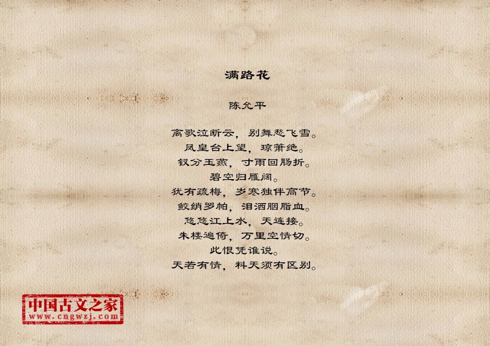 离歌泣断云,别舞愁飞雪。凤皇台上望,琼箫绝。钗分玉燕,寸雨回肠折。碧空归雁阔。犹有疏梅,岁寒独伴高节。鲛绡罗帕,泪洒胭脂血。悠悠江上水,天连接。朱楼遍倚,万里空情切。此恨凭谁说。天若有情,料天须有区别。