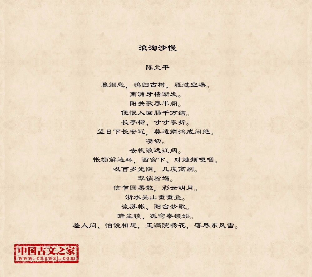 暮烟愁,鸦归古树,雁过空堞。南浦牙樯渐发。阳关歌尽半阕。便恨入回肠千万结。长亭柳、寸寸攀折。望日下长安近,莫遣鳞鸿成闲绝。凄切。去帆浪远江阔。怅顿解连环,西窗下、对烛频哽咽。叹百岁光阴,几度离别。翠销粉竭。信乍圆易散,彩云明月。浙水吴山重重叠。流苏帐、阳台梦歇。暗尘锁、孤鸾秦镜缺。羞人问、怕说相思,正满院杨花,落尽东风雪。