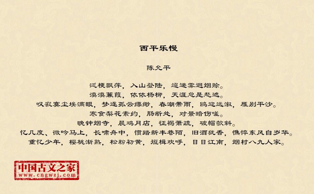 泛梗飘萍,入山登陆,迢递雾迥烟赊。漠漠蒹葭,依依杨柳,天涯总是愁遮。叹寂寞尘埃满眼,梦逐孤云缥缈,春潮带雨,鸥迎远溆,雁别平沙。寒食梨花素约,肠断处,对景暗伤嗟。晚钟烟寺,晨鸡月店,征褐萧疏,破帽欹斜。忆几度、微吟马上,长啸舟中,惯踏新丰巷陌,旧酒犹香,憔悴东风自岁华。重忆少年,樱桃渐熟,松粉初黄,短楫欢呼,日日江南,烟村八九人家。