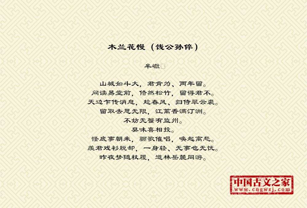 山城如斗大,君肯为、两年留。问读易堂前,翛然松竹,留得君不。天边乍传消息,趁春风、归侍翠云裘。留取去思无限,江蓠香满汀洲。不妨无蟹有监州。臭味喜相投。怪底事朝来,骊歌催唱,唤起离愁。羡君戏衫脱却,一身轻、无事也无忧。昨夜梦随杖履,道林岳麓同游。
