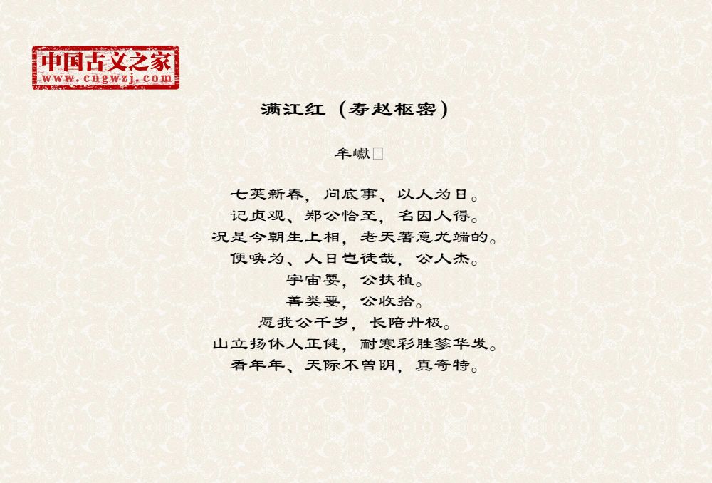七荚新春,问底事、以人为日。记贞观、郑公恰至,名因人得。况是今朝生上相,老天著意尤端的。便唤为、人日岂徒哉,公人杰。宇宙要,公扶植。善类要,公收拾。愿我公千岁,长陪丹极。山立扬休人正健,耐寒彩胜篸华发。看年年、天际不曾阴,真奇特。