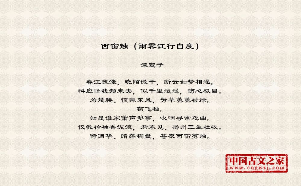 春江骤涨,晓陌微干,断云如梦相逐。料应怪我频来去,似千里迢遥,伤心极目。为楚腰、惯舞东风,芳草萋萋衬绿。燕飞独。知是谁家箫声多事,吹咽寻常怨曲。仅教衿袖香泥涴,君不见、扬州三生杜牧。待泪华、暗落铜盘,甚夜西窗剪烛。