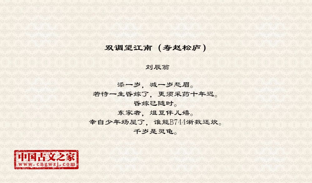 添一岁,减一岁愁眉。若待一生昏嫁了,更须采药十年迟。昏嫁已随时。东家者,俎豆伴儿嬉。幸自少年场屋了,谁能B744淅数还炊。千岁是灵龟。