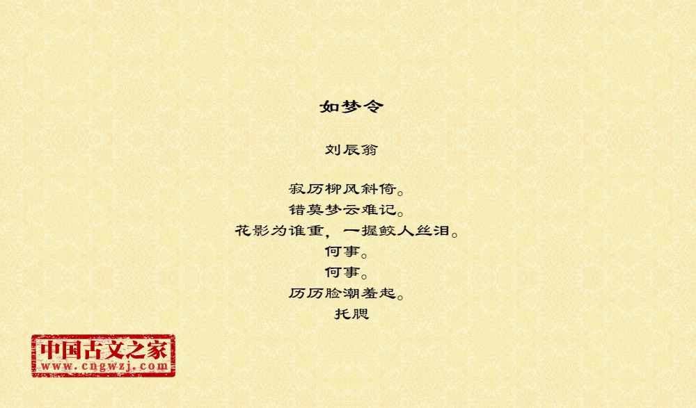 寂历柳风斜倚。错莫梦云难记。花影为谁重,一握鲛人丝泪。何事。何事。历历脸潮羞起。托腮
