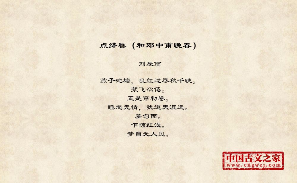 燕子池塘,乱红过尽秋千晚。絮飞欲倦。正是帘初卷。睡起无情,犹道天涯远。羞匀面。乍惊红浅。梦自无人见。