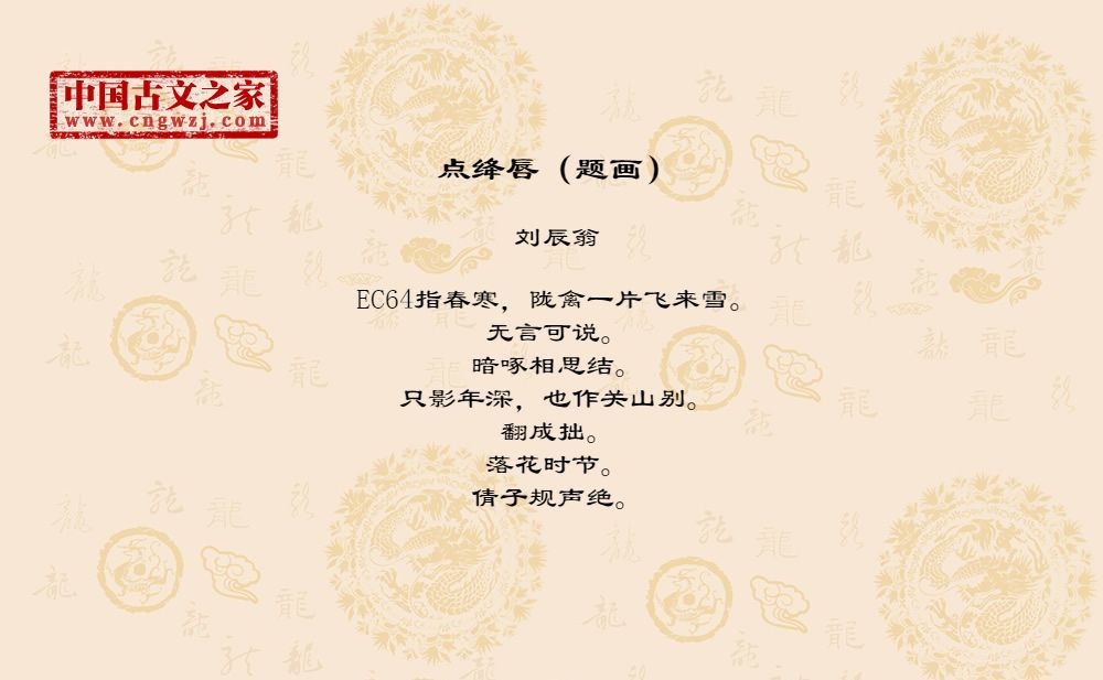 EC64指春寒,陇禽一片飞来雪。无言可说。暗啄相思结。只影年深,也作关山别。翻成拙。落花时节。倩子规声绝。