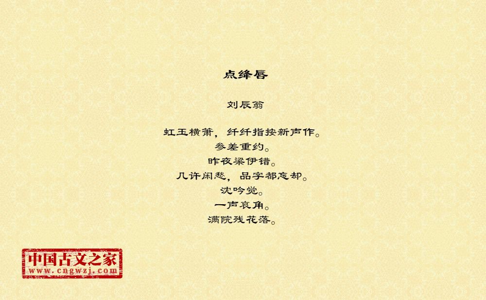 虹玉横箫,纤纤指按新声作。参差重约。昨夜梁伊错。几许闲愁,品字都忘却。沈吟觉。一声哀角。满院残花落。