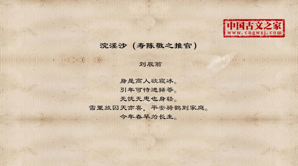 身是高人欲寝冰。引年可待进豨苓。无忧无患也身轻。雪里放囚天亦喜,平安骑鹤到家庭。今年春早为长生。