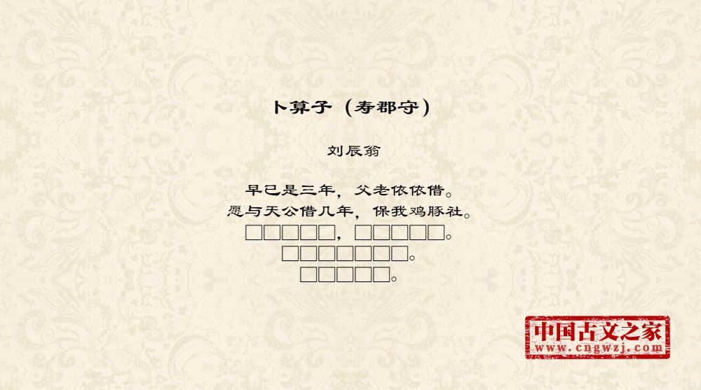 早已是三年,父老依依借。愿与天公借几年,保我鸡豚社。□□□□□,□□□□□。□□□□□□□。□□□□□。