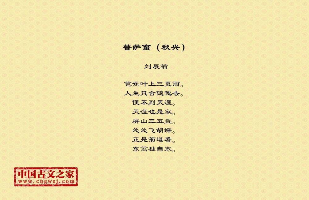 芭蕉叶上三更雨。人生只合随他去。便不到天涯。天涯也是家。屏山三五叠。处处飞胡蝶。正是菊堪看。东篱独自寒。