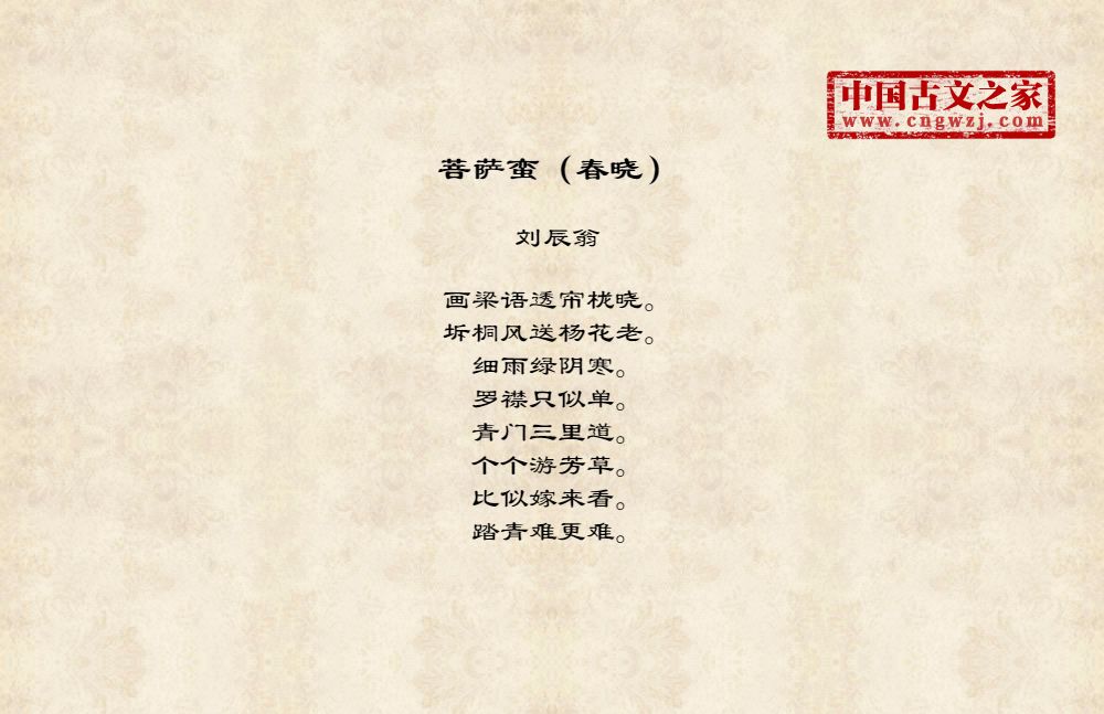 画梁语透帘栊晓。坼桐风送杨花老。细雨绿阴寒。罗襟只似单。青门三里道。个个游芳草。比似嫁来看。踏青难更难。